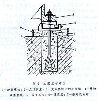 壓漿法   利用螺栓調(diào)整墊鐵壓緊灌漿層并對(duì)設(shè)備安裝進(jìn)行精調(diào)整,使墊鐵與設(shè)備底座及灌漿層緊密接觸的施工方法。其作法是:在地腳螺栓的適當(dāng)位置上焊一根小圓鋼作為螺栓調(diào)整墊鐵的支承,當(dāng)設(shè)備用臨時(shí)墊鐵安裝初步找平后進(jìn)行二次灌漿,同時(shí)在設(shè)備底座與小圓鋼中間裝入調(diào)整墊鐵,在灌漿層達(dá)到初凝后調(diào)整墊鐵的升降塊壓緊設(shè)備底座底面和灌漿層,當(dāng)灌漿層達(dá)到規(guī)定強(qiáng)度的75%以后拆除臨時(shí)墊鐵,再用螺栓調(diào)整墊鐵精調(diào)設(shè)備的水平度和標(biāo)高(圖4)。